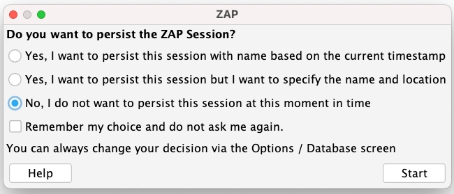 When you first start ZAP, you will be asked if you want to persist the ZAP session. Learn the difference between not persisting and persisting the ZAP session.